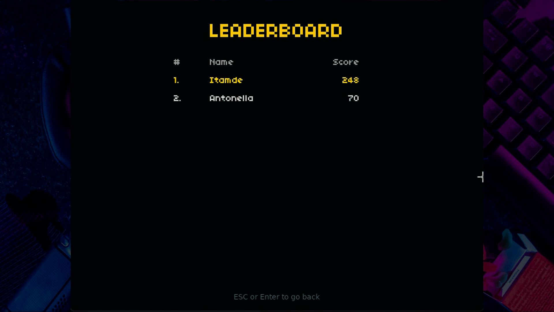 Your best runs are saved to the local leaderboard (top 10). Enter your name, claim your rank. Gold, silver, bronze -- earn your place.